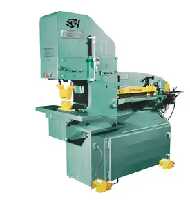 The Piranha Model PII-88 has dual-operator controls for the punch station and shear/coper stations and an Automatic Urethane Hold Down on the Plate and Angle Shear. Both ends of the machine can be operated independently of each other at the same time. A large, open punch station allows the use of a virtually unlimited range of standard accessories and special tooling, in addition to a 24" plate shear capacity.